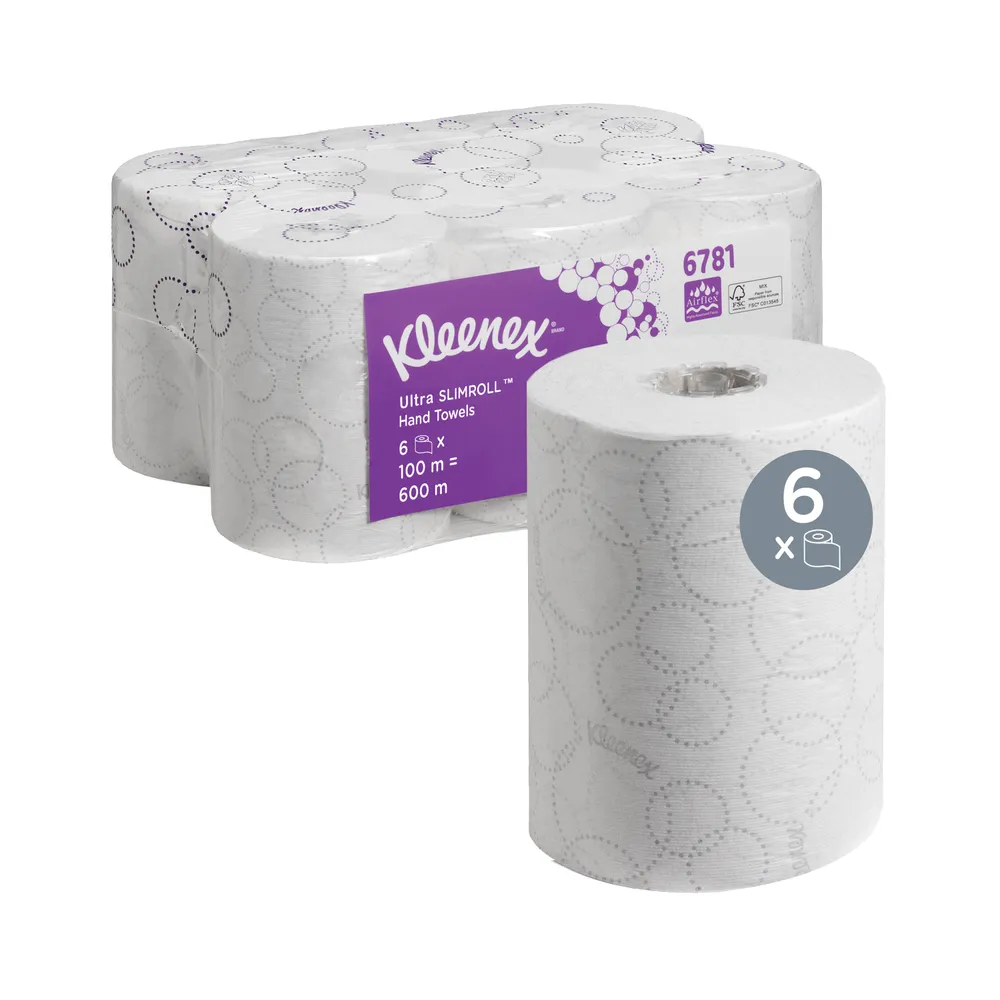 Kleenex Ultra Slimroll Hand Towels (6781) are high‑quality 2‑ply rolled towels designed for premium washrooms where space is limited but performance is essential. Each roll is 100m long and made with AIRFLEX™ technology, giving superior absorbency, softness, and strength even when wet. The Slimroll format works with compact dispensers to deliver controlled, hygienic, one‑at‑a‑time dispensing.