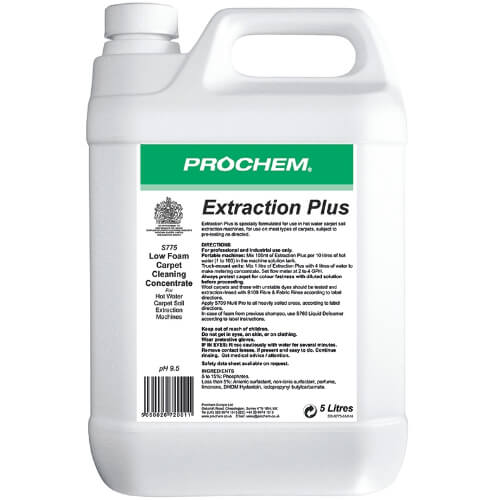 Prochem Extraction Plus 775‑05 is a powerful, low‑foaming carpet extraction detergent formulated for use in hot water extraction machines. Designed for professional carpet cleaners and facilities teams, it delivers deep cleaning performance, removes heavy soiling, and leaves carpets fresh, bright, and residue‑free.