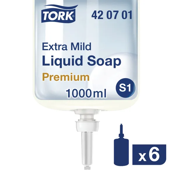 Supplied as a case of 6 x 1‑litre bottles, it is compatible with the Tork S1 liquid soap dispenser system.