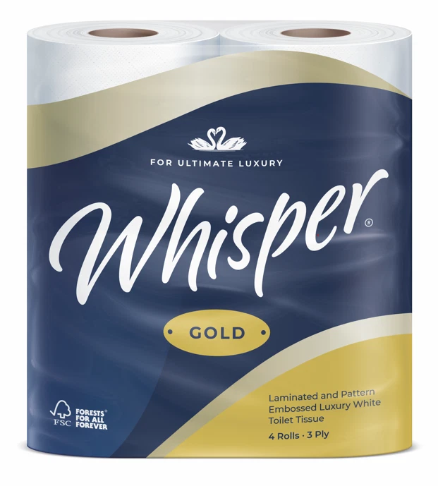 Whisper Gold is 3 ply premium toilet tissue that is stylish and luxurious to the touch; the gold standard in toilet tissue. It is manufactured from pure pulp and features a unique, contemporary embossment with lamination for exceptionally high quality. Pack contains 10 packs of 4 toilet rolls.